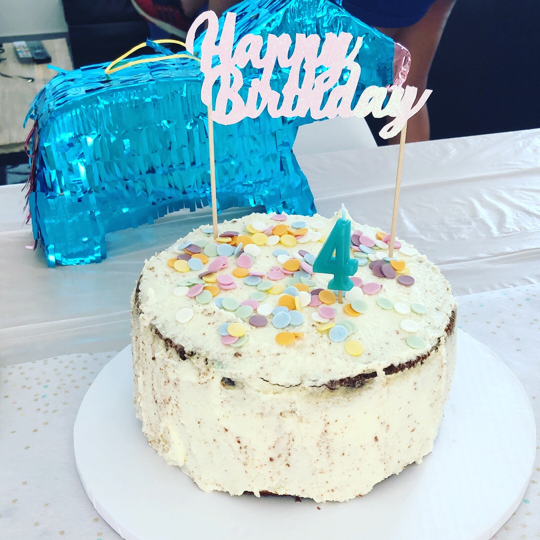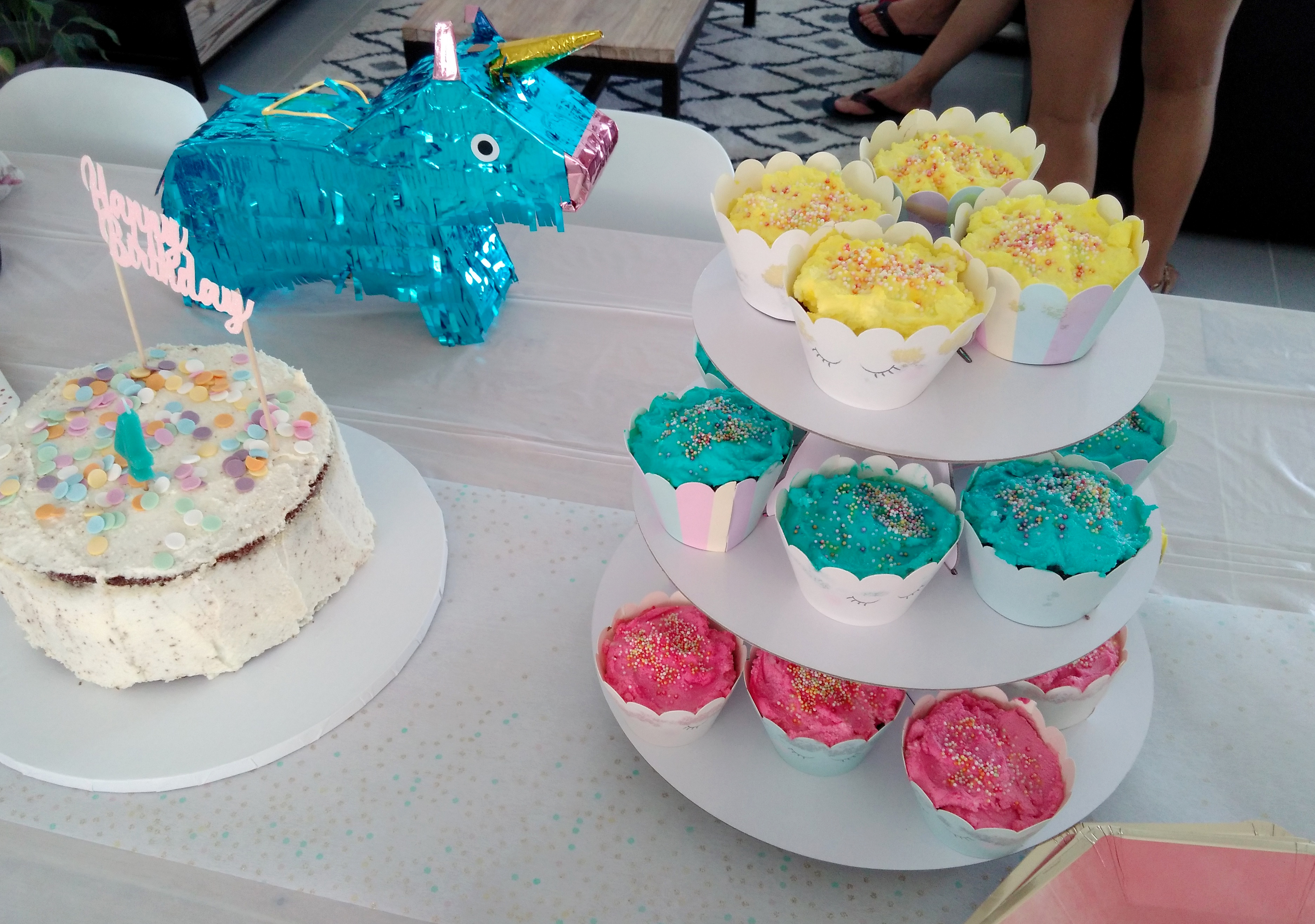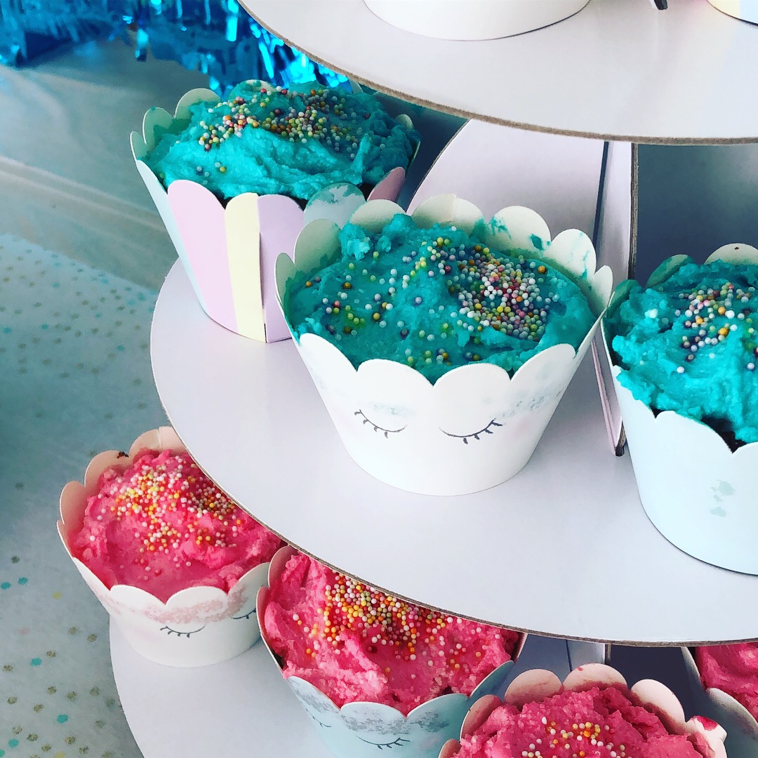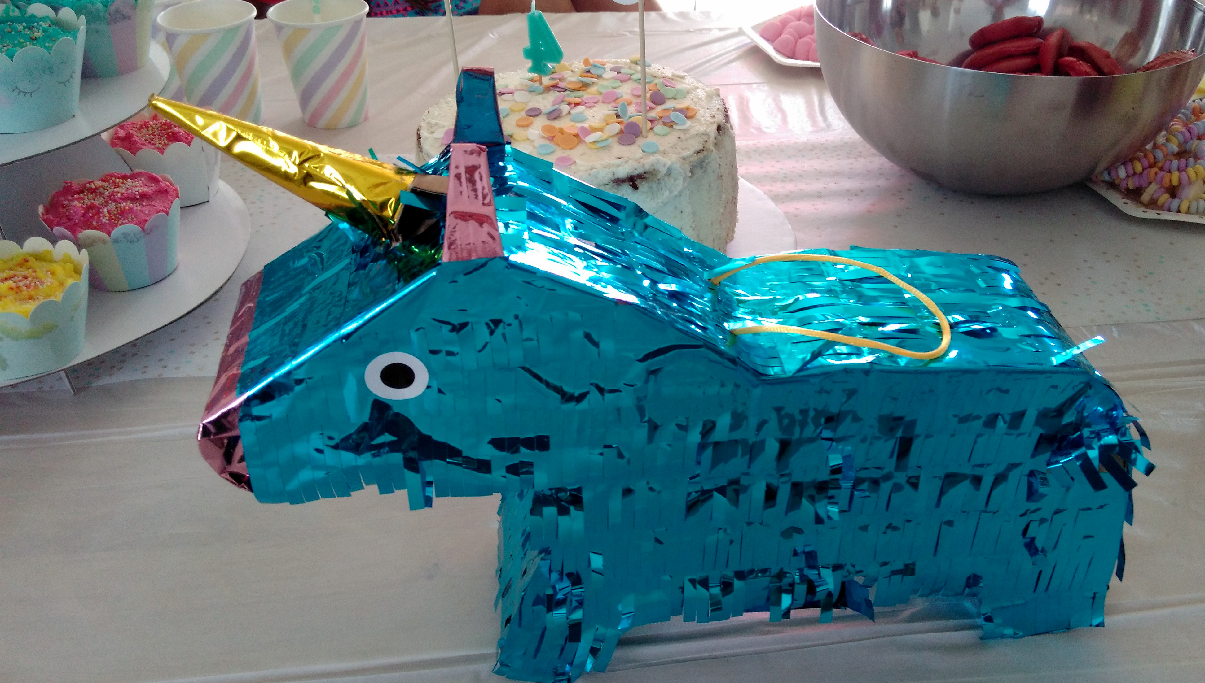 J’ai acheté des soucoupes et autres bonbons un peu régressifs (les colliers de bonbons, les guimauves artisanales…) qui allaient super bien avec les couleurs douces du thème, on a coloré de la limonade en rose pour la mettre dans la fontaine à boissons (que je ressors à chaque anniversaire depuis le baptême civil champêtre des filles), entreposé les cupackes sur un présentoir blanc (astuce : réutiliser un présentoir en carton Hema du côté non utilisé, ici celui de l’anniversaire Vaiana d’octobre dernier qui a une face colorée et une face blanche !), mis les pailles et couverts dans une jolie jar jaune pâle gardée pour l’occasion et accroché la guirlande vegaooparty. La pinata Hema trouvée en soldes a d’abord été utilisée pour décorer la sweet table avant d’être accrochée à l’extérieur pour que les enfants la tapent ! D’ailleurs, elle est très dure à détruire, prévoyez plutôt d’accrocher des fils en dessous et de faire une ouverture au préalable…