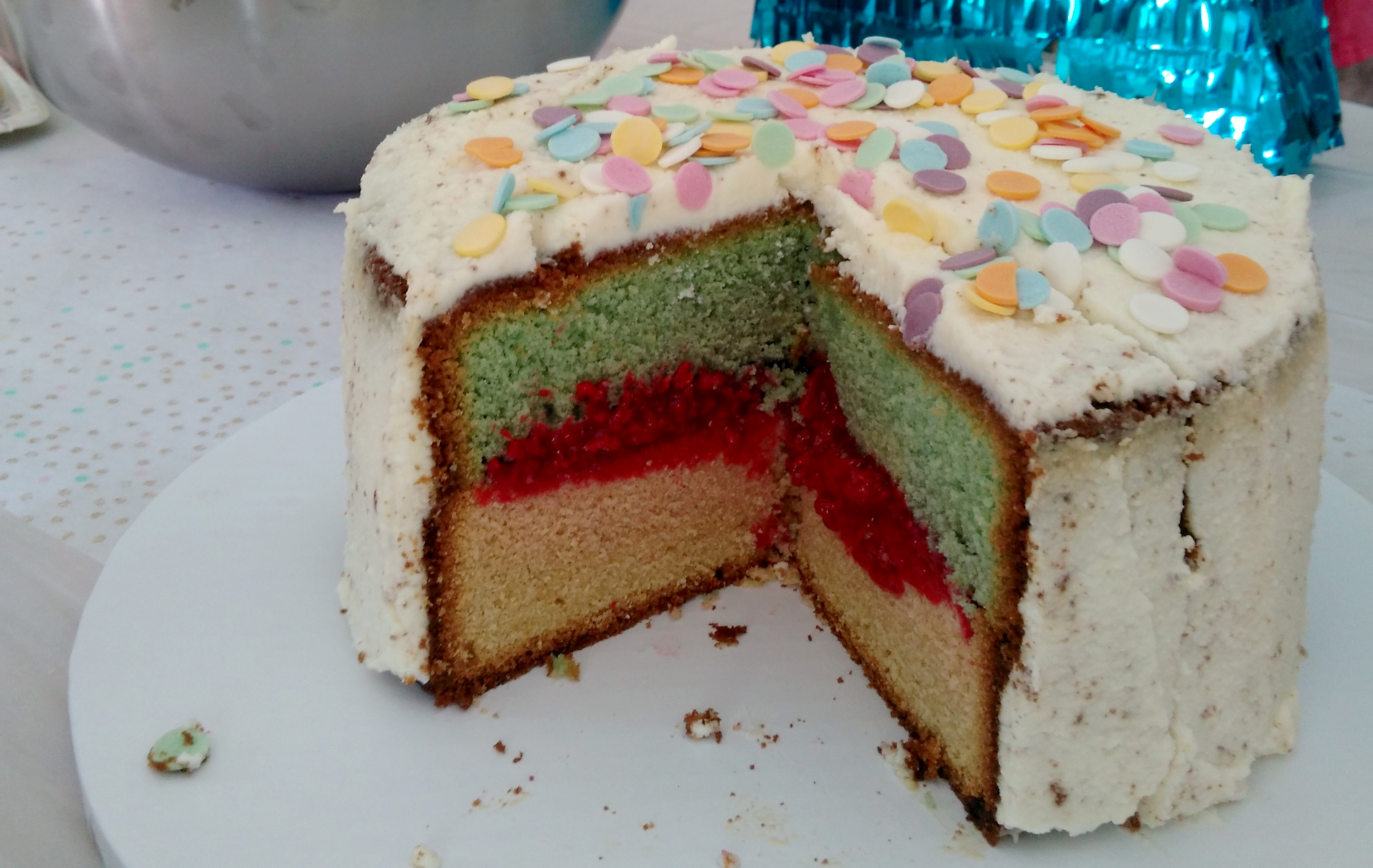 Le gâteau n’était pas comme je le voulais : les colorant à l’intérieur ont rendu bizarre (on en parle du violet qui devient… gris puis vert ?) et j’ai râté ma crème au beurre à la meringue suisse (en même temps, par 35 degrés, c’était prévisible) donc j’ai du la remplacer par ma crème de secours : mascarpone sucre glace, la même que sur les cupcakes. D’ailleurs, le glaçage des cucpakes à transpiré sur les wrappers (à noter pour plus tard : cuire des cupcakes sans caissettes même en beurrant les moules, mauvaise idée !)… Et pourtant j’étais très contente du résultat et il a beaucoup plu à ma Miniloute. C’était loin d’être parfait et pourtant ça l’était !
