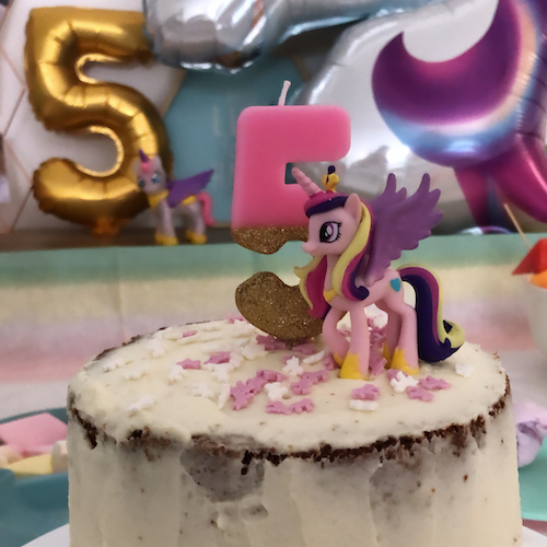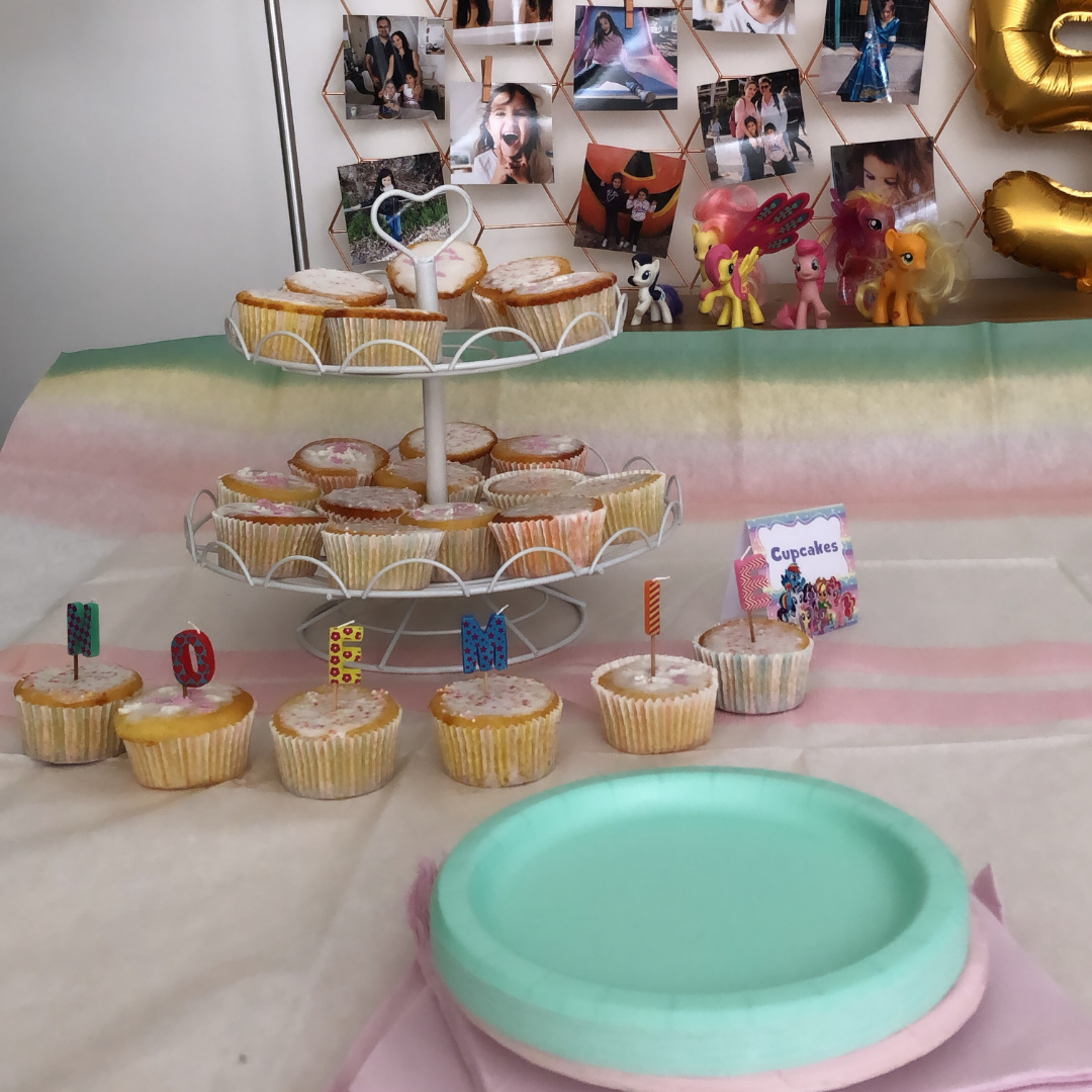 On a opté pour du simple, mais efficace : nappe pastel, chemin de table en crépon rose clair, jouets My Little Pony en déco, gros ballon mylar Licorne et chiffre 5. Pour les gourmandises, on retrouve les traditionnels cupcakes, mais cette fois décorés par mes filles ! Je peux vous dire que j’ai vu prendre sur moi mais elles étaient si heureuses que ça sera à refaire pour le prochain anniversaire… Et pendant ce temps là, je pouvais finir la déco de mon gâteau tranquillement.