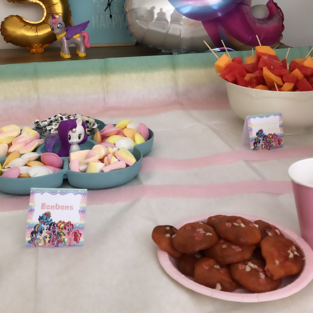 Je vous en ai déjà parlé, pour ses 5 ans ma petite dernière voulait un anniversaire Petit Poney. J’ai rassemblé quelques petites décos dans les tons pastel (il m’en restait pas mal de l’anniversaire Pastel de l’an dernier), profité des soldes pour faire mon shopping chez My Little Day et Hema, mais le temps a pas mal manqué cette année pour faire une sweet table My Little Pony digne de ce nom.