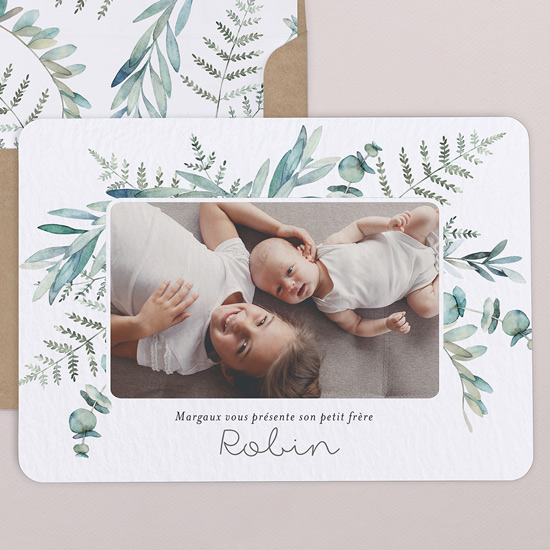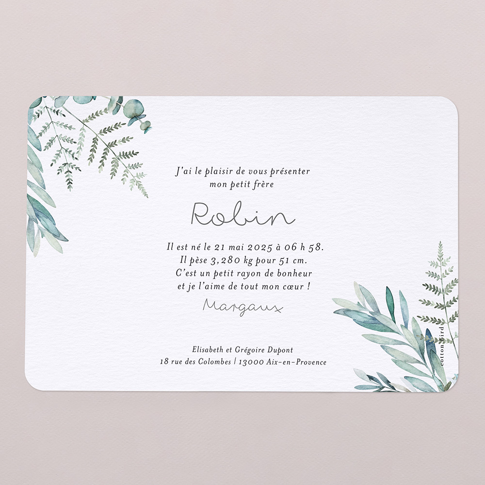 Nous avons donc choisi le faire part Calixte chez Cotton Bird : un faire part simple recto verso, une seule photo et un décor frais et végétal. C’était exactement ce que l’on souhaitait et je l’aime encore plus en vrai !