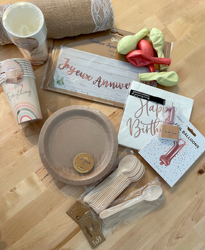 Je n’ai pas encore tout acheté mais l’essentiel est là ! J’ai passé commande sur Save The Deco pour les assiettes, les gobelets, les serviettes, la guirlande, les ballons, la bougie et les couverts en bois.