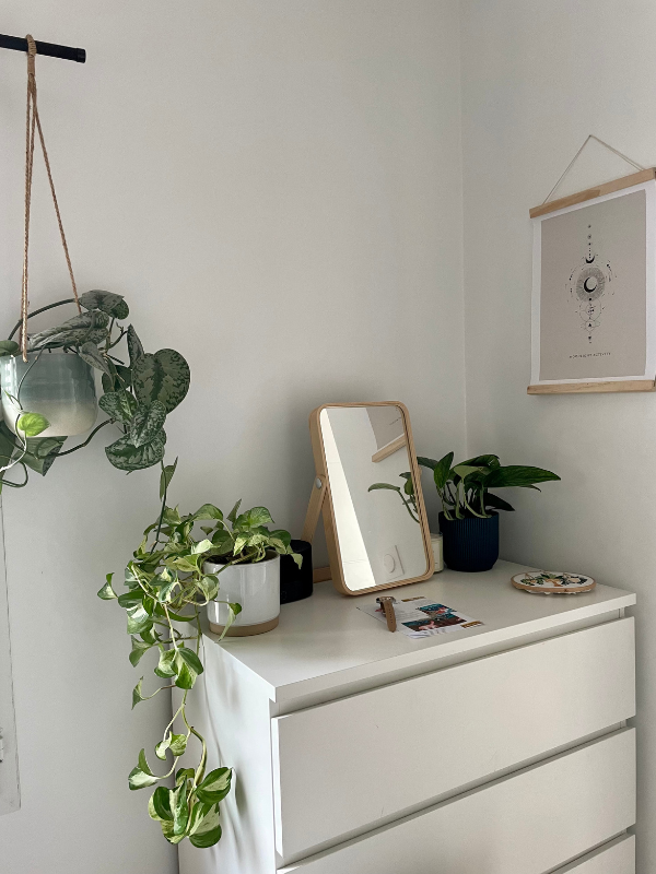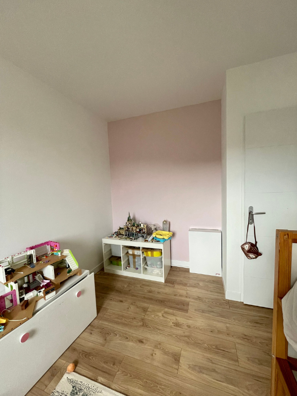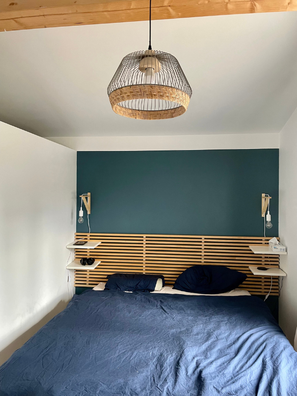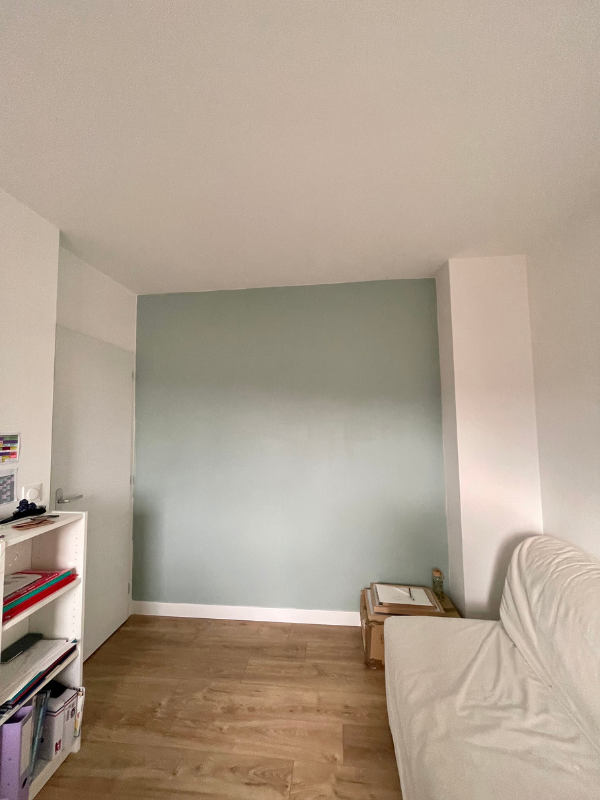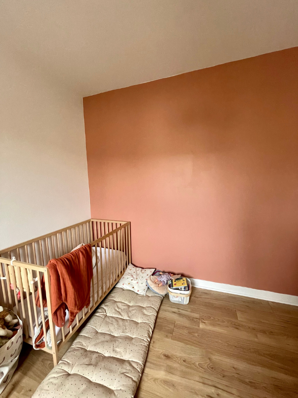 Déjà, tous les murs de couleurs ont été peints (et par moi, en plus !) : les murs de couleur dans les chambres ainsi que celui du coin bureau dans le salon. Je suis contente du rendu même si ce n’est pas parfait. Les plinthes de toutes les chambres sont posées, le dressing dans notre chambre, notre tête de lit et le bureau sont installés… J’ai même un coin coiffeuse !