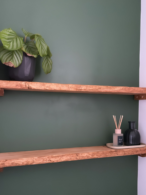 J’aime vraiment beaucoup le rendu des étagères et du meuble. C’est d’ailleurs du sur mesure puisque tout a été fait à partir de bois brut qui a ensuite été coupé, taillé et poncé par mon mari avant d’être vitrifié avec un vernis spécial cuisine et salle de bain. Ça nous a permis de foncer le bois pour atteindre la teinte désirée (chêne doré) mais aussi de le protéger.