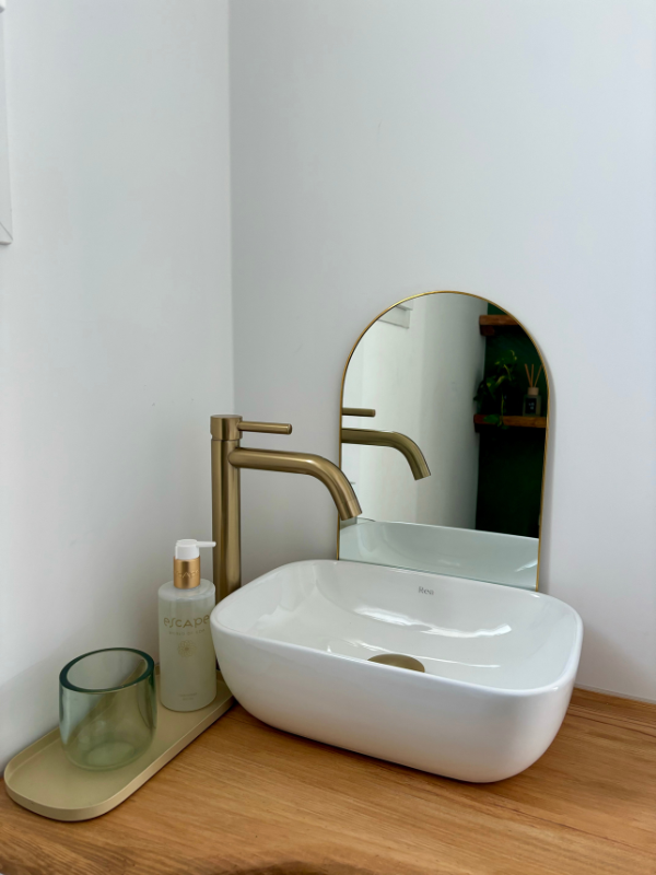 J’ai voulu un robinet couleur champagne / étain / or brossé et ça rend vraiment super bien. Par contre qu’est-ce que j’ai galéré à trouver un distributeur de savon qui allait avec ! Ceux qui me suivent sur instagram savent à quel point j’ai pinaillé sur le sujet (j’ai acheté 3 distributeurs différents, quand même) et le dernier en date n’a pas tout à fait la bonne couleur mais… j’ai décidé de m’en accomoder.