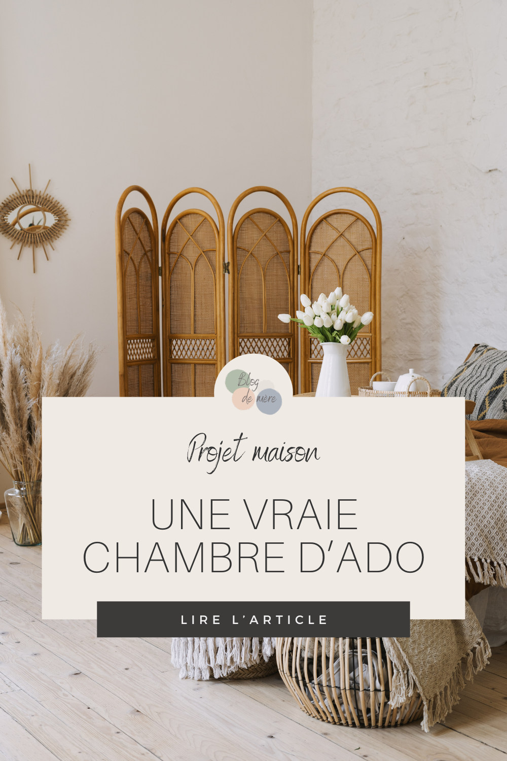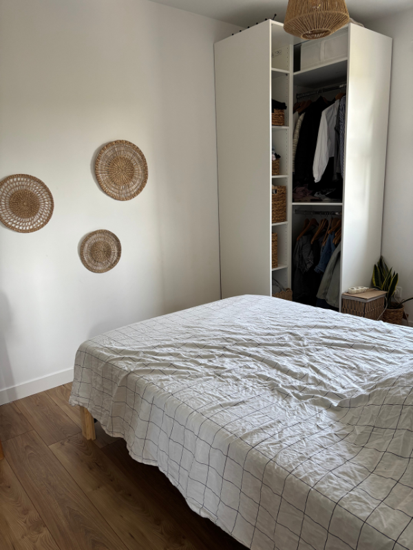 Côté déco, ma grande voulait du bohème, du rotin, du bois clair, du blanc et du beige. On a trouvé une jolie tête de lit en rotin chez Gifi totalement par hasard lors d’un déstockage. Ensuite, on a choisi un lit deux places en bois chez le suédois avec un sommier à lattes.