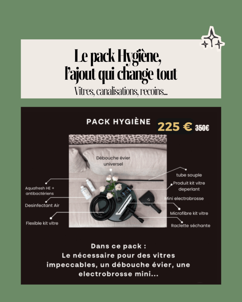 Pack HygièneMini électrobrosse, embout débouche évier, tige soufflette, produits Sanitizer et AquafreshNettoyer vitres, meubles laqués, parois de douche, coussins, sièges auto, recoinsHygiène approfondie, grandes surfaces vitrées, recoins et surfaces délicates225 € (au lieu de 350 €)