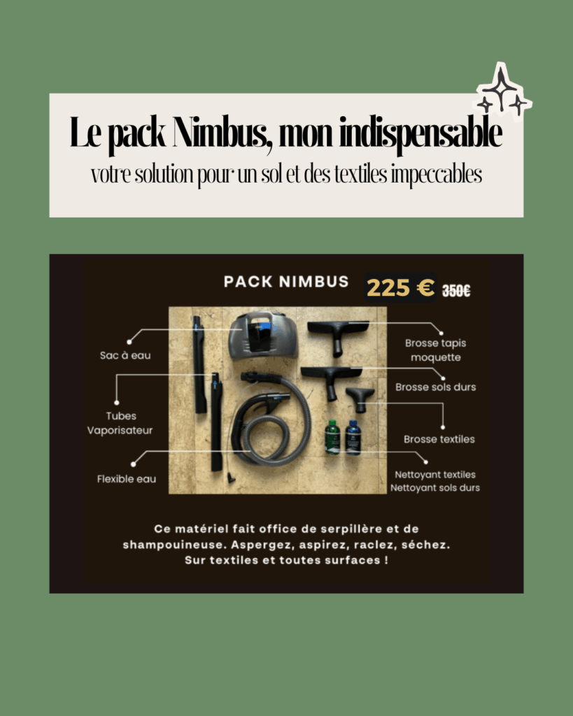 Pack NimbusSac à dos, embout shampouineuse, brosse moquette, raclettes silicone sols durs, produits détachants et solAspirer + laver sols, shampouiner textiles (canapés, tapis, rideaux)Gain de temps, idéal familles avec enfants et animaux, nettoyage combiné225 € (au lieu de 350 €)